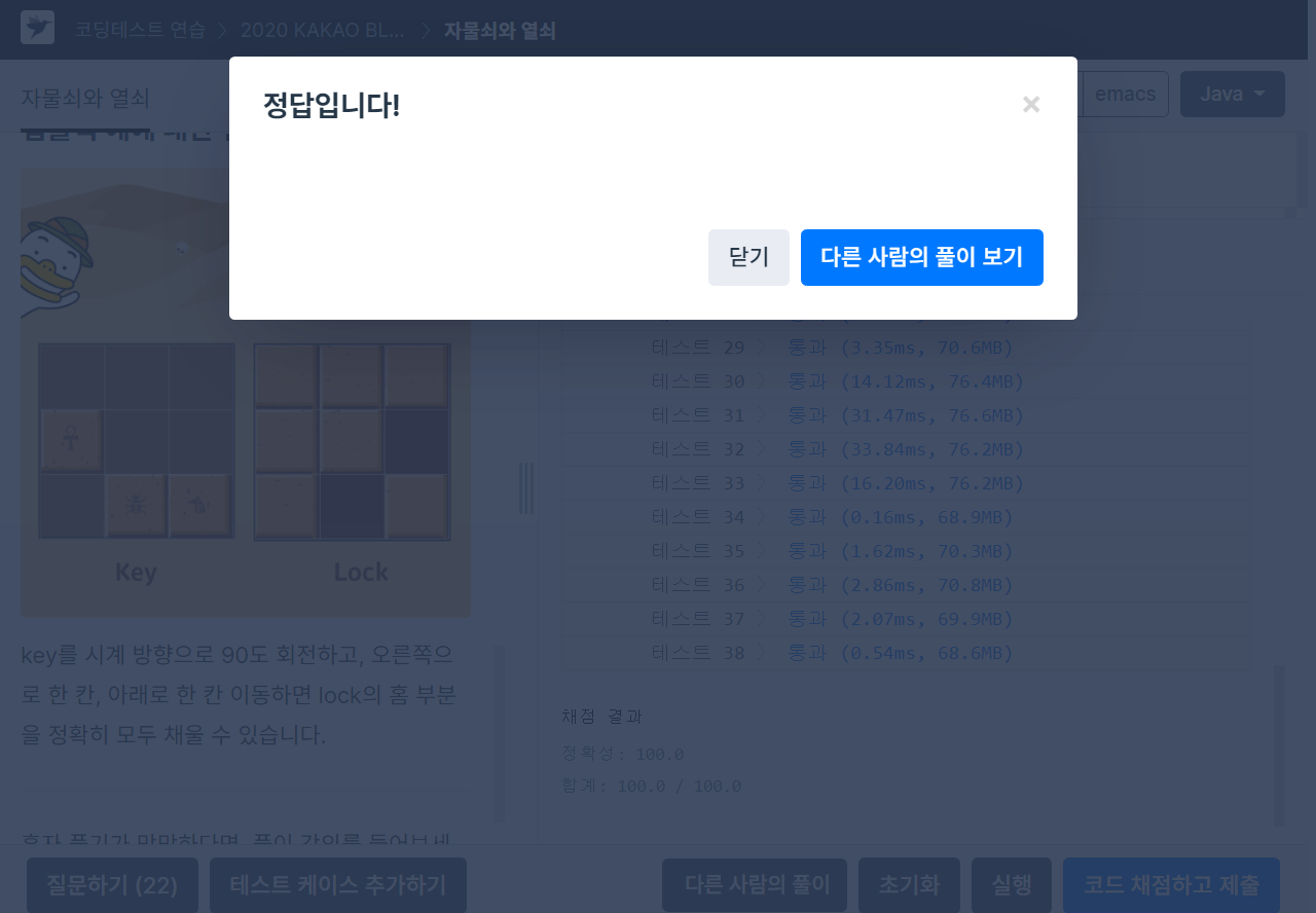 열쇠를 나타내는 2차원 배열 key와 자물쇠를 나타내는 2차원 배열 lock이 매개변수로 주어질 때, 열쇠로 자물쇠를 열수 있으면 true를, 열 수 없으면 false를 return 하도록 solution 함수를 완성해주세요.