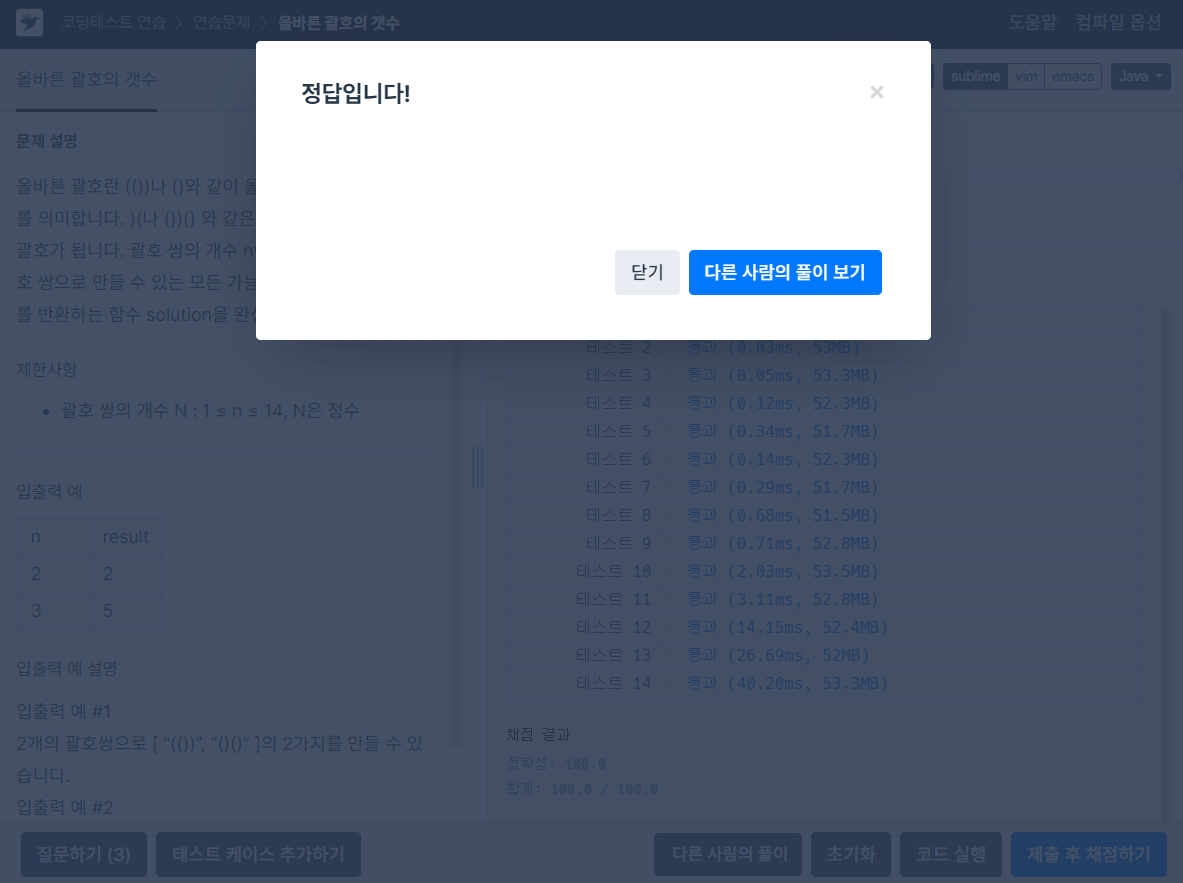 올바른 괄호란 (())나 ()와 같이 올바르게 모두 닫힌 괄호를 의미합니다. )(나 ())() 와 같은 괄호는 올바르지 않은 괄호가 됩니다. 괄호 쌍의 개수 n이 주어질 때, n개의 괄호 쌍으로 만들 수 있는 모든 가능한 괄호 문자열의 갯수를 반환하는 함수 solution을 완성해 주세요.제한사항