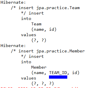 다른 부분은 JPA설정과 트랜잭션, 영속성컨텍스트 관리니 무시해도 좋다. 여기서 봐야 하는 곳은 team을 member.setTeam으로 member 쪽에 Set 해준다는 것이다.