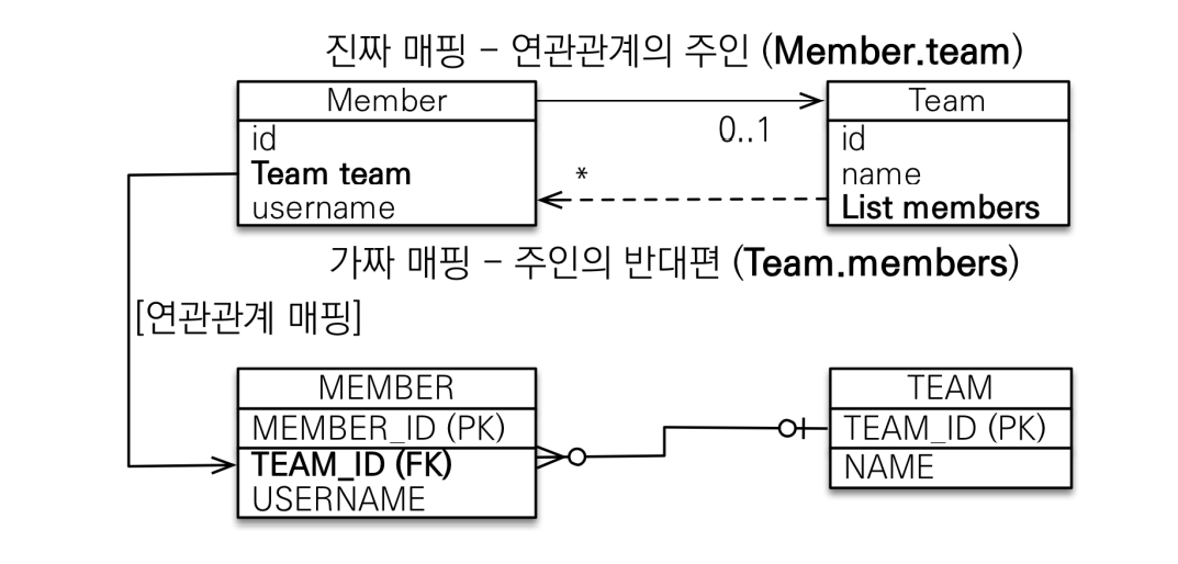 - 연관관계의 주인(Owner) : 객체 양뱡향 연관관계에서, 두 객체의 외래 키를 관리하는 관점 이해