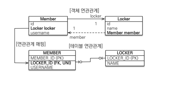 - 테이블은 외래 키 하나로 두 테이블의 연관관계를 맺음