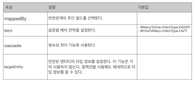 - 대상 테이블(주인의 반대편)에는 mappedBy 속성 필요