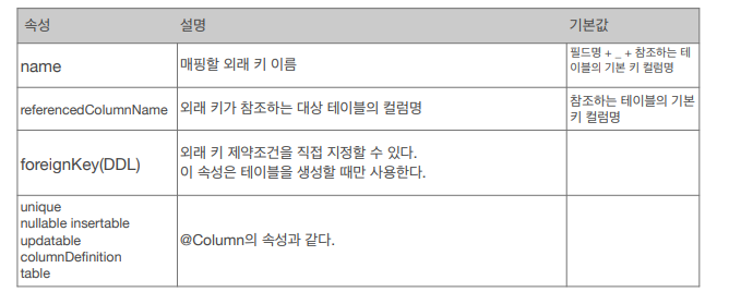 - @JoinColumn을 꼭 사용해야 함. 그렇지 않으면 조인 테이블(테이블 하나 추가되는 현상) 방식을 사용함