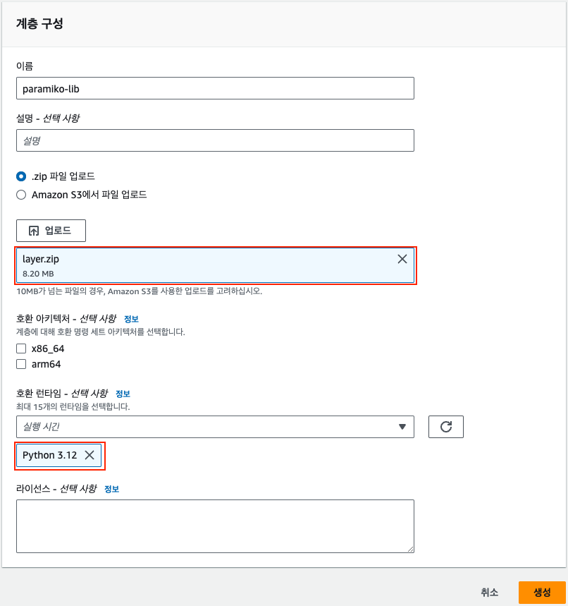 2. 계층 업로드 (layer.zip)