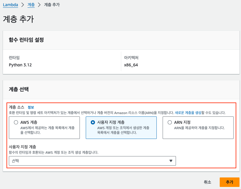 - 2에서 업로드했던 계층 선택 (안뜨면 계층 생성에서 호환 런타임을 설정했는지 확인해보자)