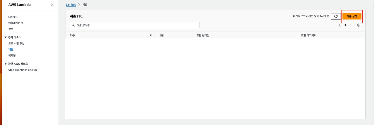 AWS Lambda 서비스로 이동 후 "계층 생성" 버튼을 클릭해주자.