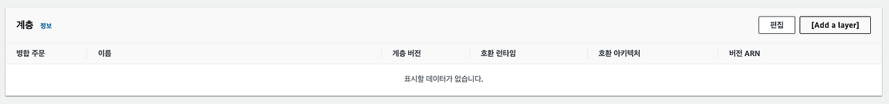 방금 생성한 Lambda 함수를 선택한 다음, 화면을 내리면 계층 섹션이 보인다. (Add a layer 클릭)