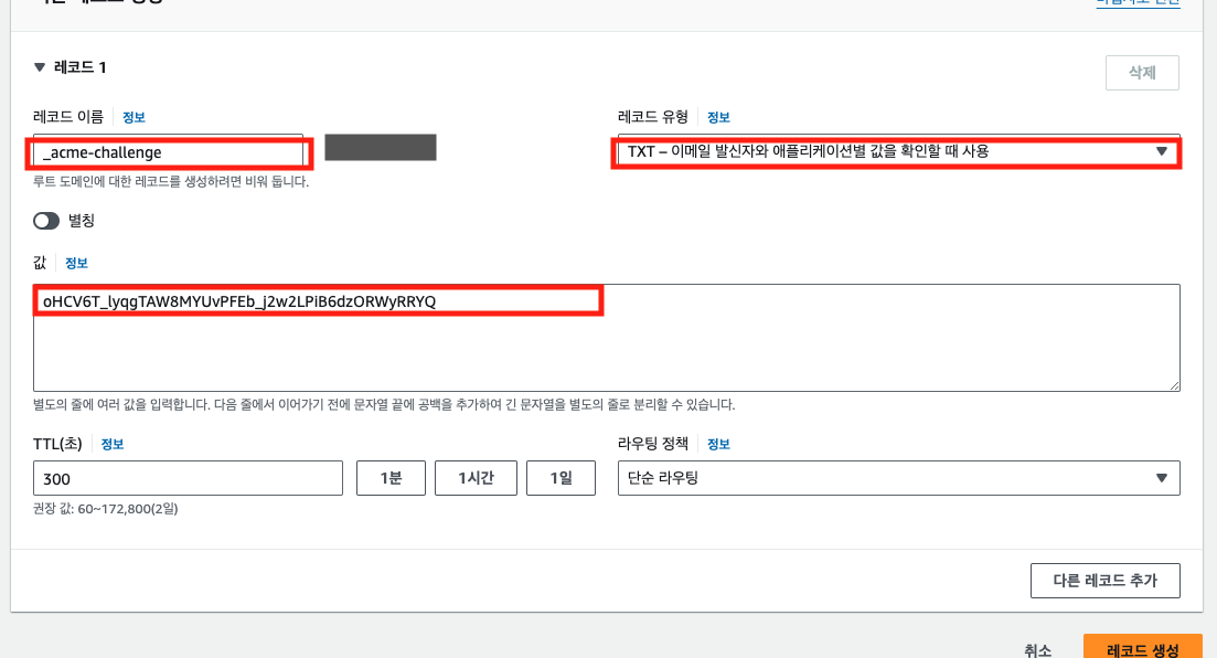 레코드 이름과 값을 호스팅 영역 > 레코드 추가 버튼을 통해 등록해줍니다.