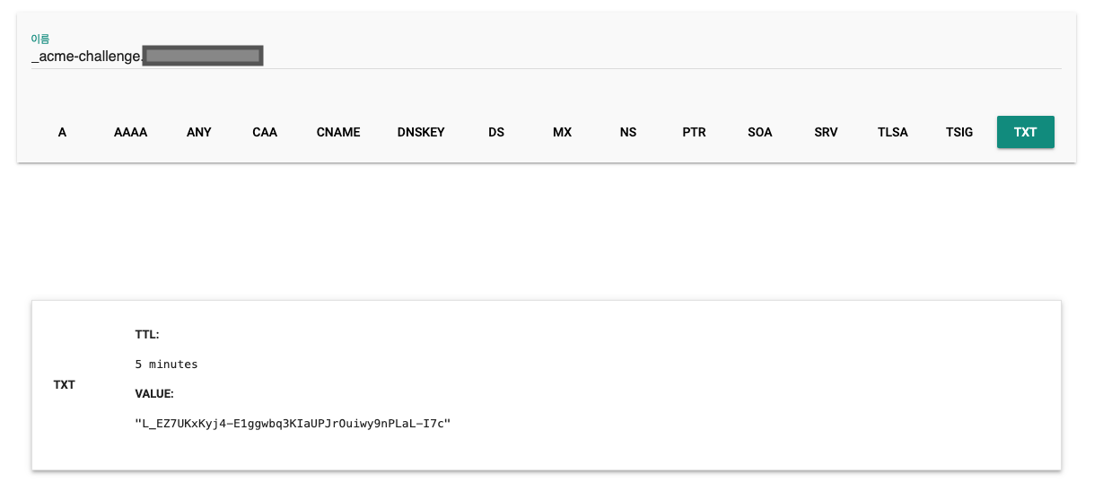 https://toolbox.googleapps.com/apps/dig/#TXT/_acme-challenge.{등록한 도메인}.