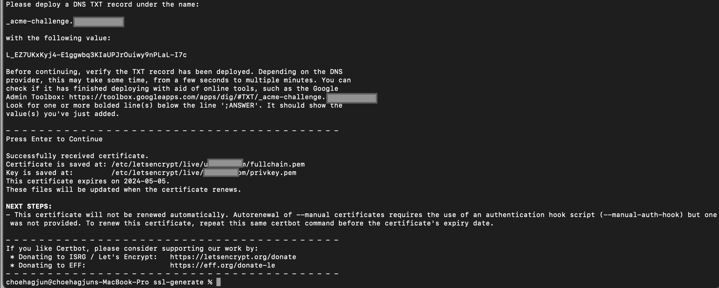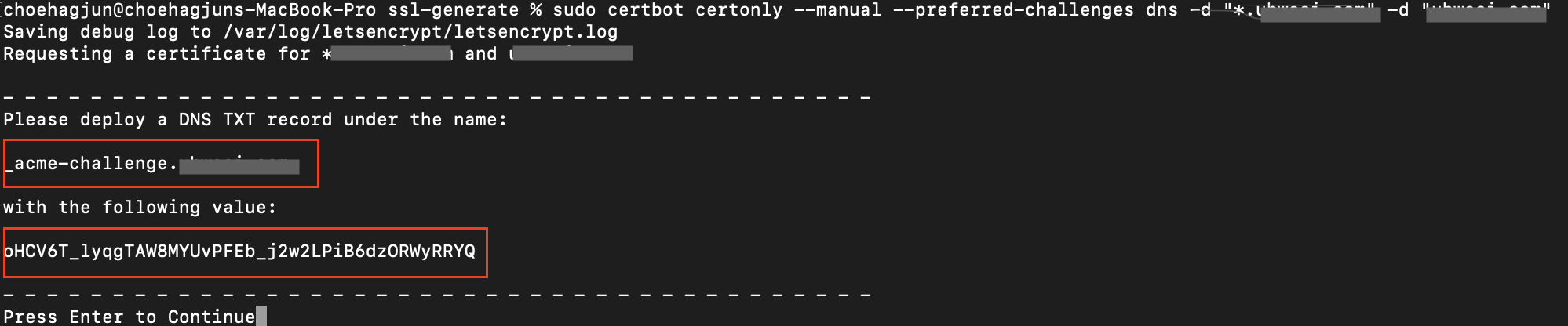 여기서 주의사항이 하나 있는데 방금 등록한 도메인에 대해 DNS 배포가 정상적으로 이루어진 다음에 Enter를 눌러야 한다는 것입니다.