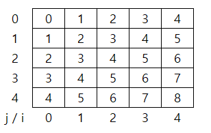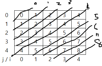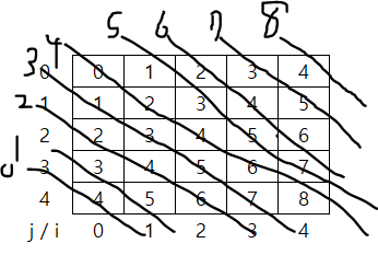 - 바로 예를 들어보자 i=1, j=4와 i=0, j=3인 부분이 같은 대각선 라인에 있다 규칙은 i - j + (n-1) 같다.